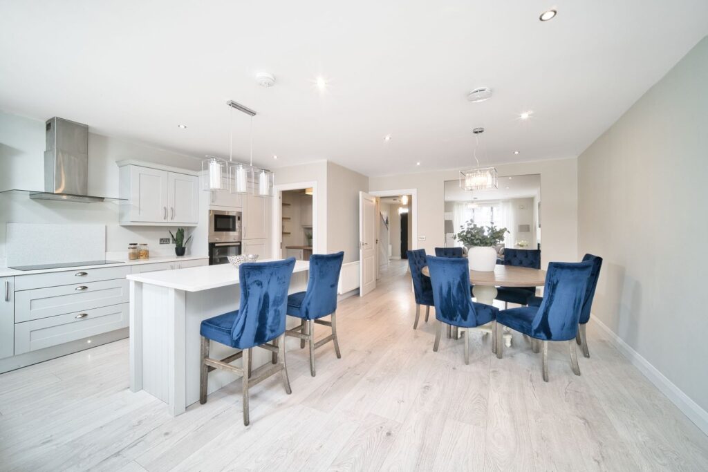 The property greets you with an elegant hallway, with tasteful stair runner and fitted laminate floor which continues through the living room, kitchen, and utility room. There are bespoke drawers fitted under the stairway for tidy storage, along with a fully tiled Guest W.C. The living room flows seamlessly into dining area, which gives it a spacious, open feeling and the electric fireplace creates a warm and cosy atmosphere. The spacious kitchen includes a lot of features, such as a breakfast bar, integrated appliances, L.E.D lights fitted within the glass cabinets and on the kickboard around the prep area, a fully plumbed utility room and stylish French doors that leads into the back garden.