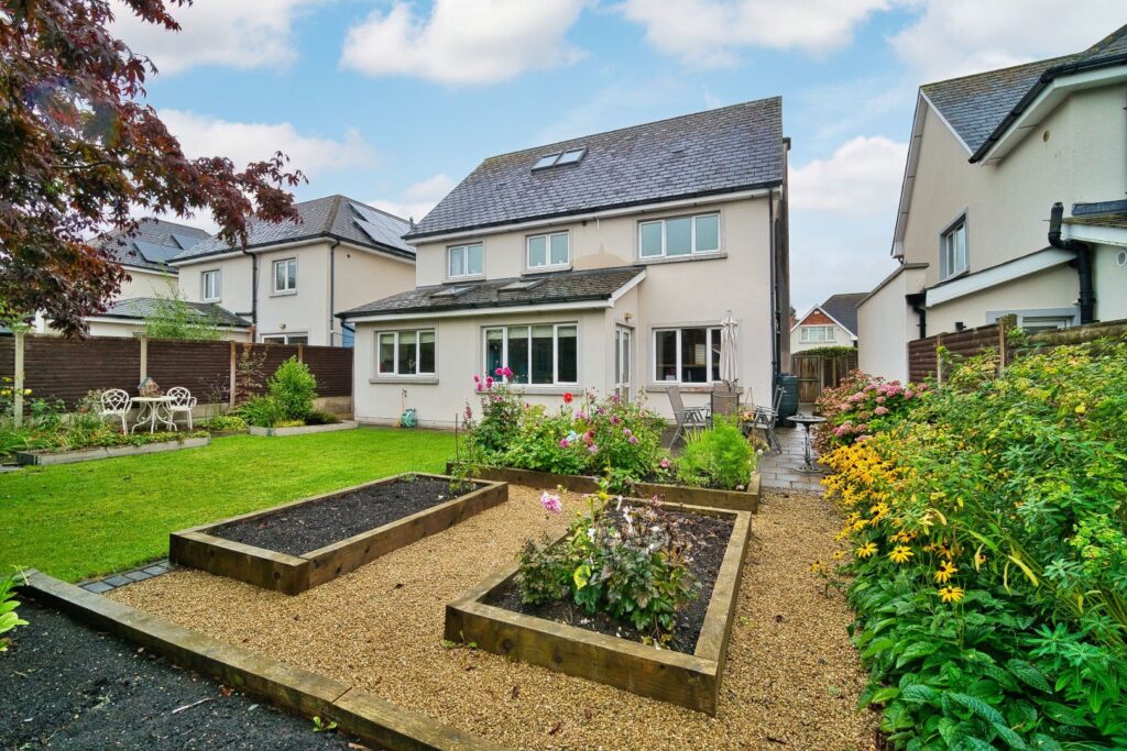 The rear garden is a serene, private space framed by mature planting, raised beds, and concrete fencing. A large patio area is ideal for outdoor dining or entertaining, while the manicured lawn and thriving vegetable patch will appeal to green-fingered buyers.