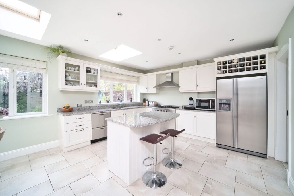 The heart of the home lies in the open-plan kitchen/dining room. Highlights include soft-close cabinetry, a central island with seating, granite worktops, and a Waterford gas range double oven. Skylights flood the space with natural light, and double doors lead directly out to the rear garden, creating a seamless indoor-outdoor flow.